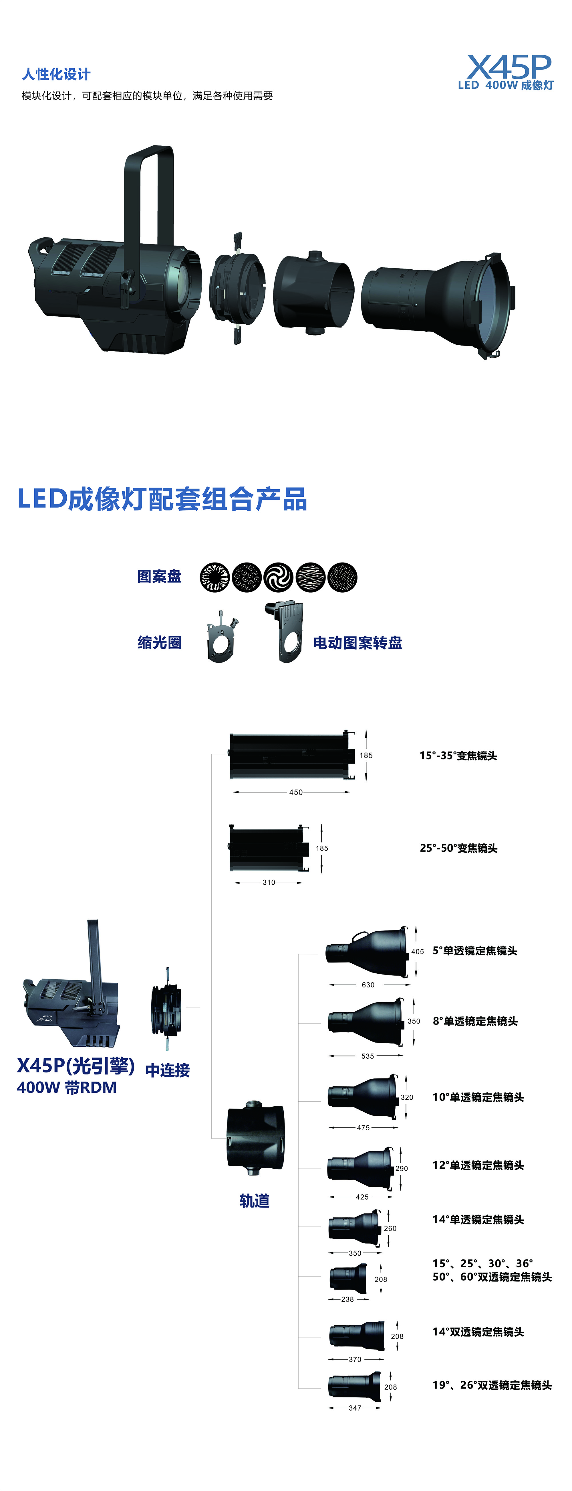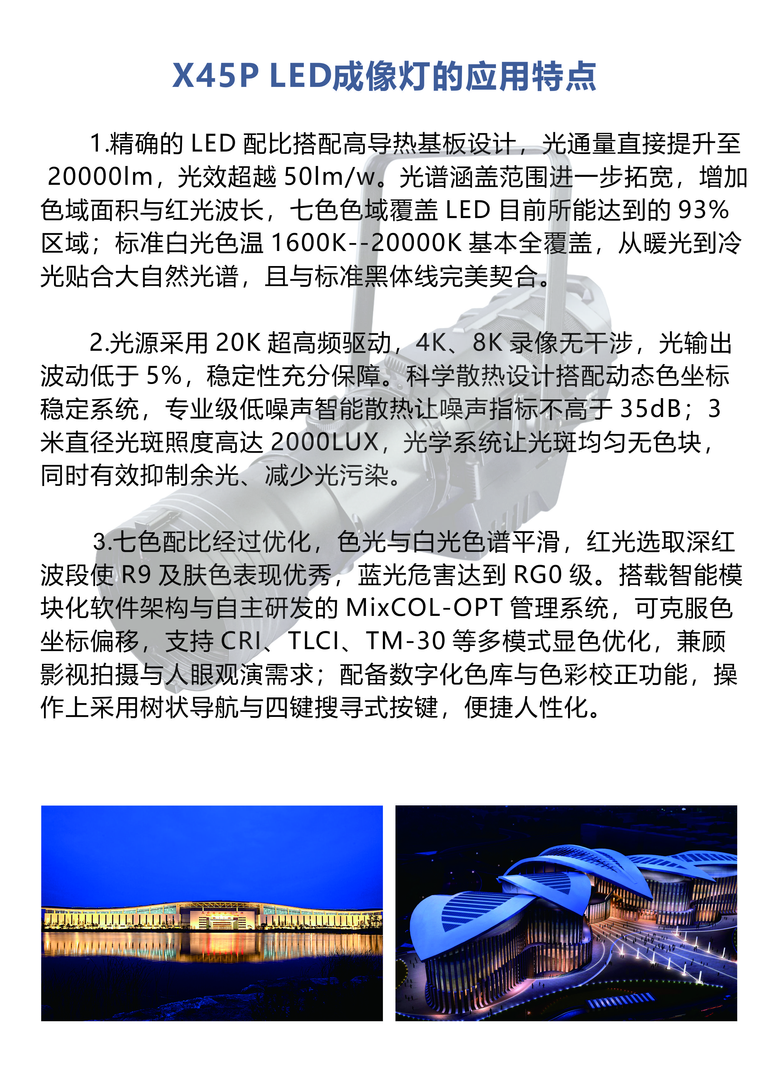 X45系列成像灯,采用专业的光学设计,无论七色,白光,光斑均匀无色块。7色连续色谱混合超宽色域,涵盖当前LED可表达的93%色域范围,全色温段高显色的专业级色彩还原,直径3M光斑,照度高达2000LUX。专业级的低噪声智能散热管理,一米噪声小于35db。集成光源管理、混光优化、光色校正管理系统,更首创以光色定义为基础的数字化色库系统,助力照明设计精准落地需求,为舞台特效、影视调色提供更灵活的创意方案。