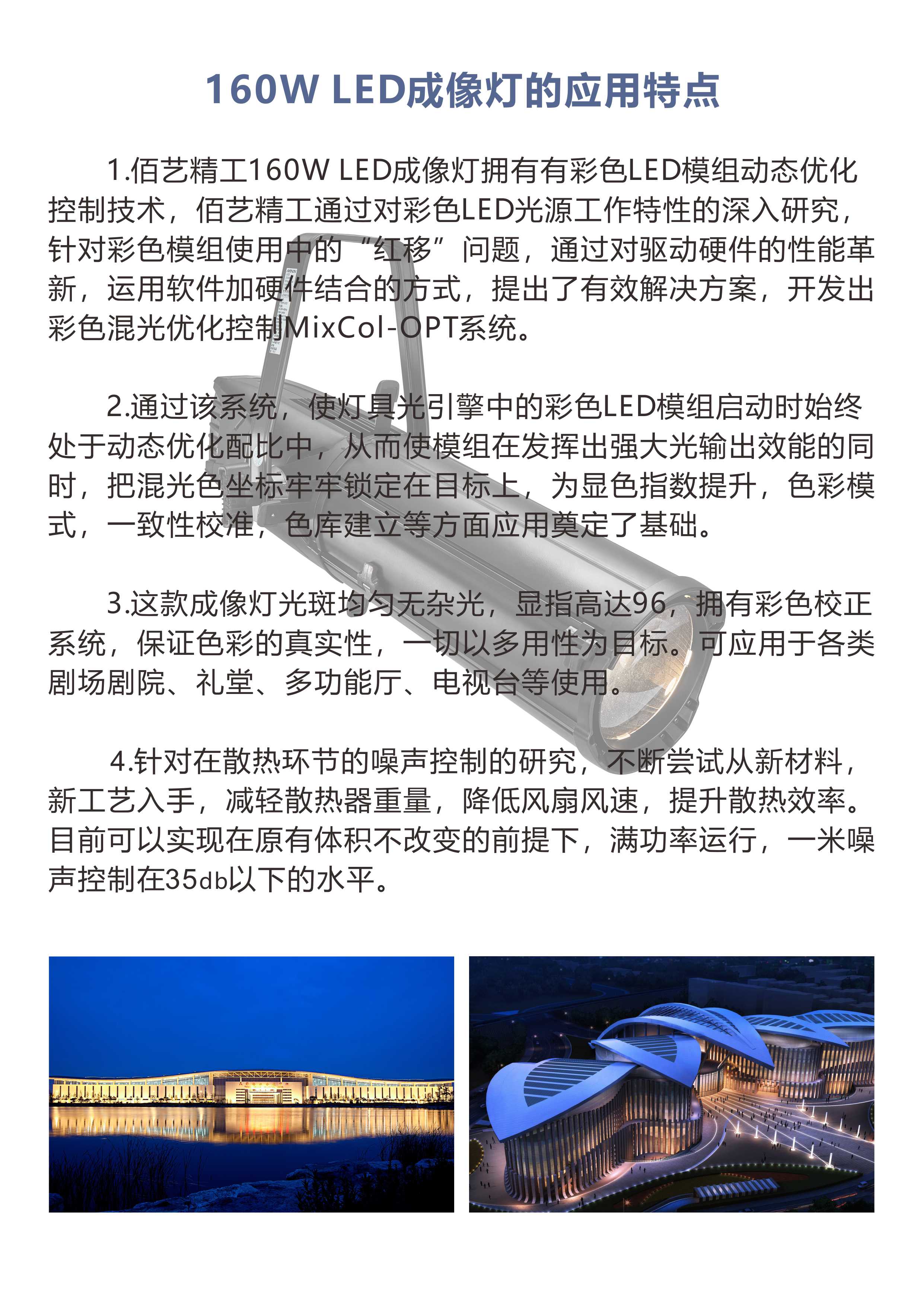 LED变焦成像灯采用高效节能的150W大功率LED光源替代传统的卤素光源,其高亮度,低频闪,环保无辐射的特性,可有效减少对被照人或物品的侵害。可选光束角度:变焦12-25°/20-35°,专业独特的散热设计使灯具具有良好的散热性能,可有效减少光衰,延长使用寿命,灯体小巧轻便,适合会议室、礼堂等中小型项目使用。