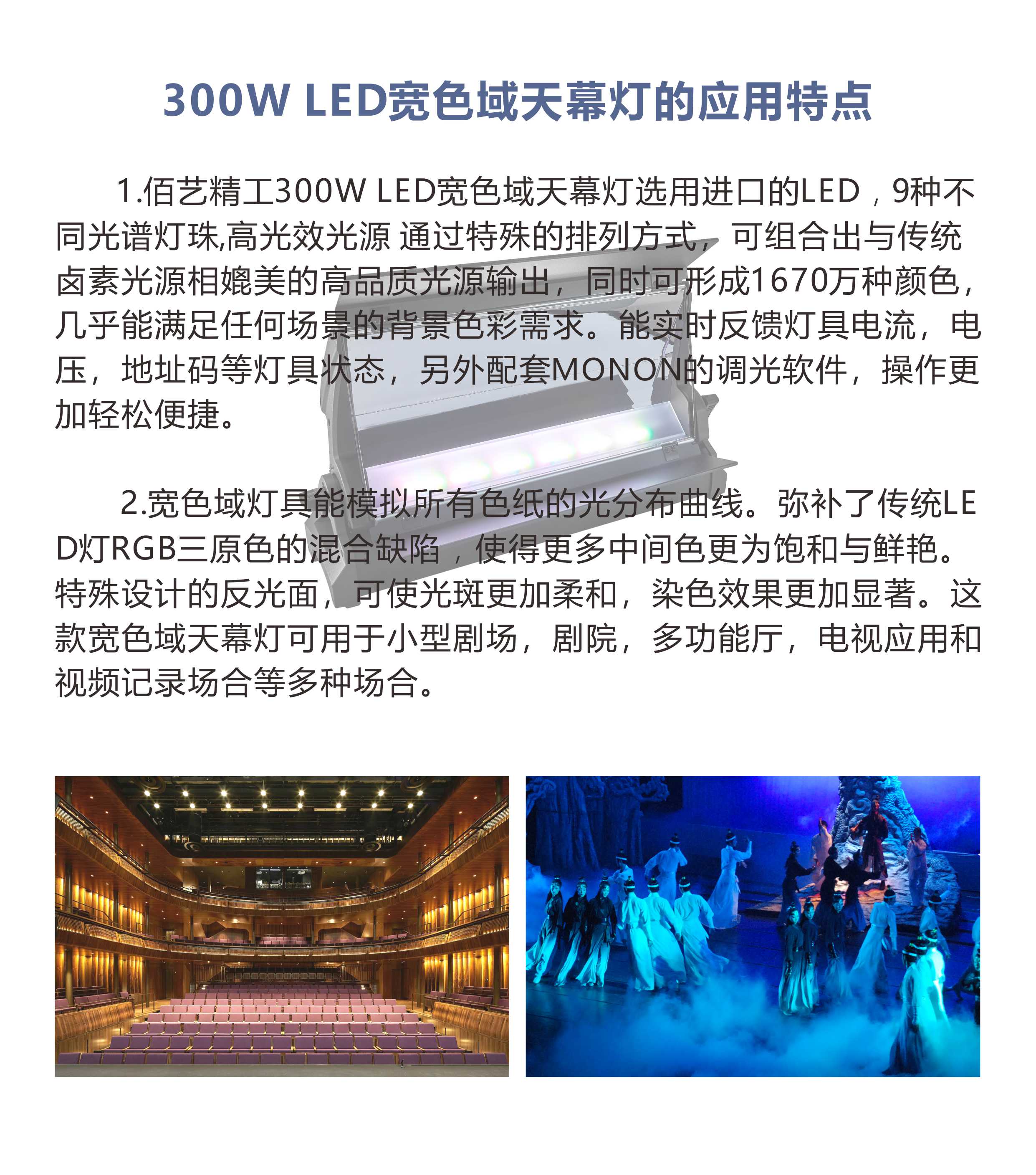 300W宽色域LED天幕灯,搭载7组差异化光谱LED灯珠,搭配高光效发光芯片,经专属点阵排布优化,输出光质无限接近传统卤素光源,色彩细腻纯正。灯具可精准调配1670万种色彩,轻松适配各类舞台场景背景染色需求。